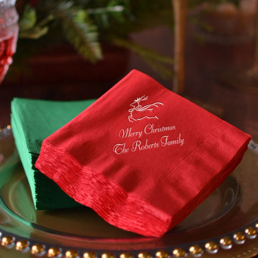 Your guests will love this little added attention to detail complimenting your Christmas table decorations. Choose from a variety of designs, imprint colors, napkin colors, and lettering styles to customize your holiday napkins.
